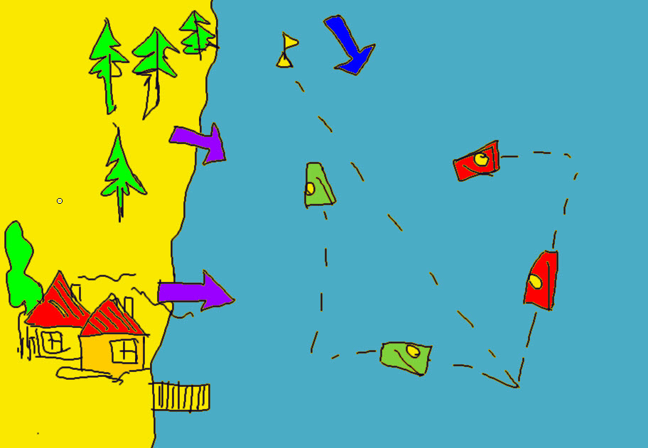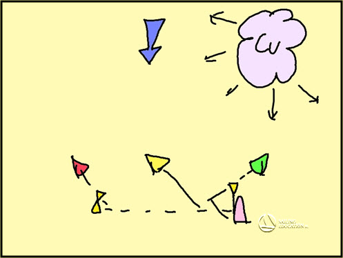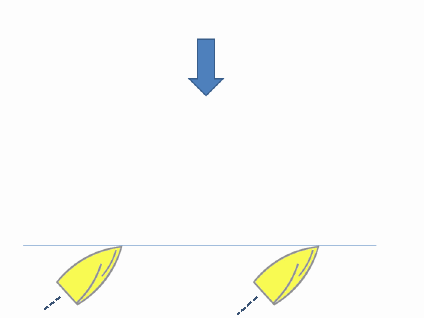 Dwa jachty płyną na lewym halsie. Linia przed dziobami jachtu jest prostopadła do kierunku wiatru i wyznacza pozycję w stosunku do wiatru, (który jacht jest bliżej wiatru?) Jeżeli znak kursowy trasy ustawiony jest pod wiatr to linia wyznacza, który jacht jest bliżej znaku. Niebieska strzałka u góry rysunku pokazuje zmiany kierunku wiatru. Przychodzi zmiana z lewej strony i w tym momencie jacht z lewej jest bliżej wiatru, następnie wiatr wraca i przychodzi zmiana z prawej strony. Po pewnym czasie jacht z prawej wykonuje zwrot i przechodzi przed dziobem jachtu po lewej. Jacht z prawej strony wychodzi na prowadzenie.